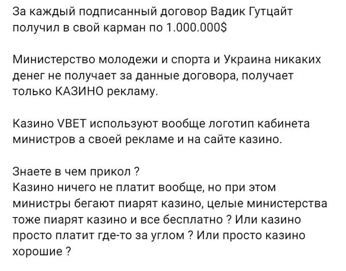 Згідно з цим договором міністерство рекламує казино на всіх можливих майданчиках. Причому абсолютно безкоштовно. І не може розірвати угоди. Міністр Гутцайт, який підписав цю угоду, пішов зі своєї посади, але міністерство договір розірвати не може – він так прописаний. Непоганий бізнес, як ви бачите?